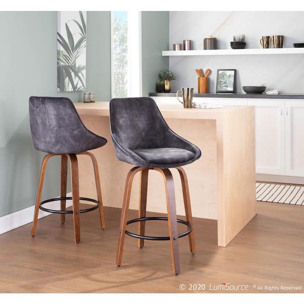 Diana 25.50 in. Solid Back Counter Height Stool in Grey Velvet and Walnut Wood with Round Black Footrest (Set of 2)