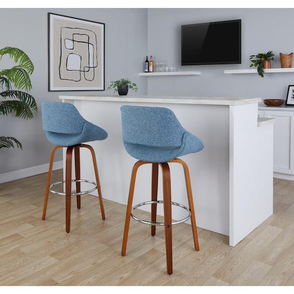 Fabrico 29.5 in. Blue Noise Fabric, Walnut Wood, and Chrome Metal Fixed-Height Bar Stool (Set of 2)
