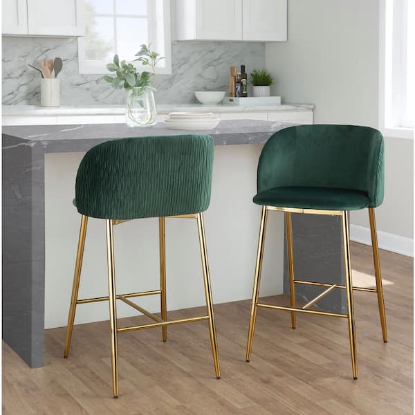 Fran Pleated Waves 36 in. Green Velvet and Gold Metal High Back Counter Height Bar Stool (Set of 2)