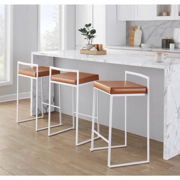 Fuji 27.75 in. Camel Faux Leather and White Metal Stackable Counter Stool (Set of 3)