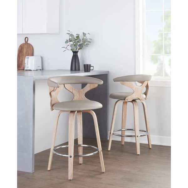 Gardenia 25.5 in. Light Grey Faux Leather and White Washed Wood Counter Stool with Round Chrome Footrest (Set of 2)