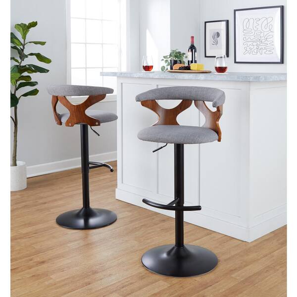 Gardenia 32.5 in. Light Grey Fabric, Walnut Wood and Black Metal Adjustable Bar Stool (Set of 2)