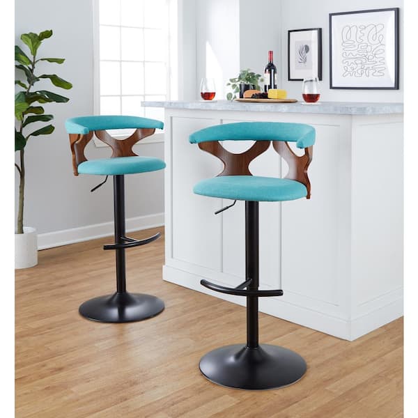 Gardenia 32.5 in. Teal Fabric, Walnut Wood and Black Metal Adjustable Bar Stool (Set of 2)
