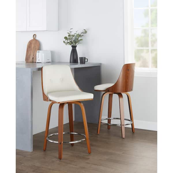 Gianna 24.25 in. White Faux Leather, Walnut Wood and Chrome Metal Fixed-Height Counter Stool Round Footrest (Set of 2)