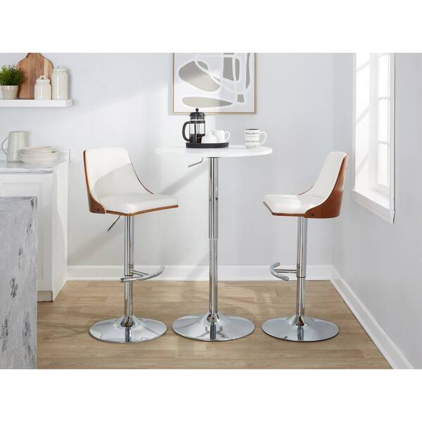 Gianna 32.75 in. White Faux Leather, Walnut Wood and Chrome Metal Adjustable Bar Stool (Set of 2)