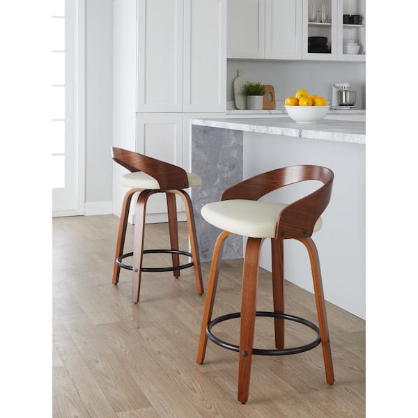 Grotto 24 in. Cream Faux Leather, Walnut Wood and Black Metal Fixed-Height Counter Stool (Set of 2)