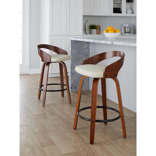 Grotto 25.25 in. Cream Faux Leather, Walnut Wood, and Black Metal Fixed-Height Counter Stool (Set of 2)