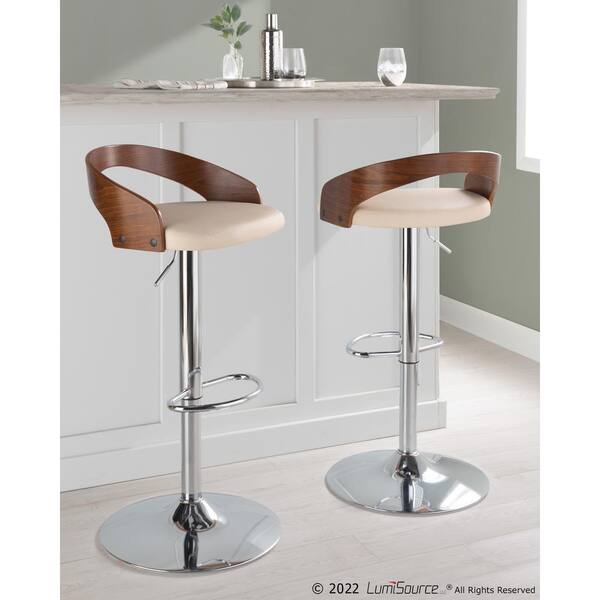 Grotto 39 in. Cream Faux Leather, Walnut Wood and Chrome Metal Adjustable Bar Stool with Oval Footrest (Set of 2)
