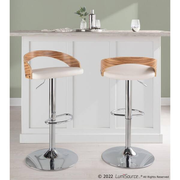 Grotto 39 in. White Faux Leather, Zebra Wood and Chrome Metal Adjustable Bar Stool with Oval Footrest (Set of 2)