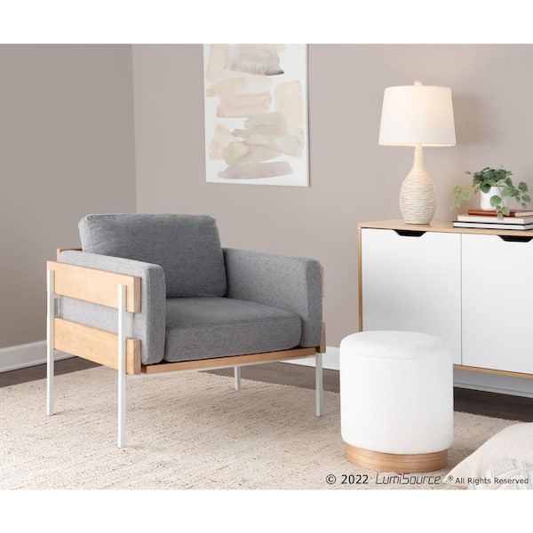 Kari Light Grey Fabric and Natural Wood Arm Chair with White Metal Base