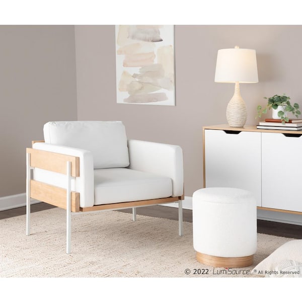 Kari White Faux Leather, Natural Wood and White Metal Arm Chair