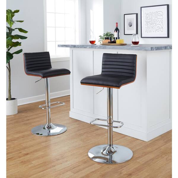 Mason 32.75 in. Black Faux Leather, Walnut Wood and Chrome Metal Adjustable Bar Stool (Set of 2)