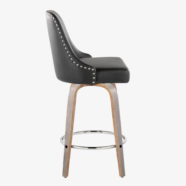 Studded Marcel 27" Light Grey Wood and Black Faux Leather Fixed-Height Counter Stool with Chrome Footrest (Set of 2) LYW