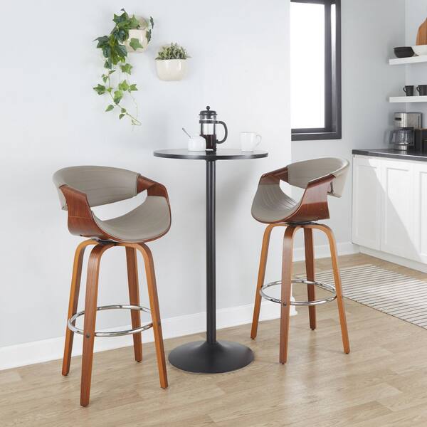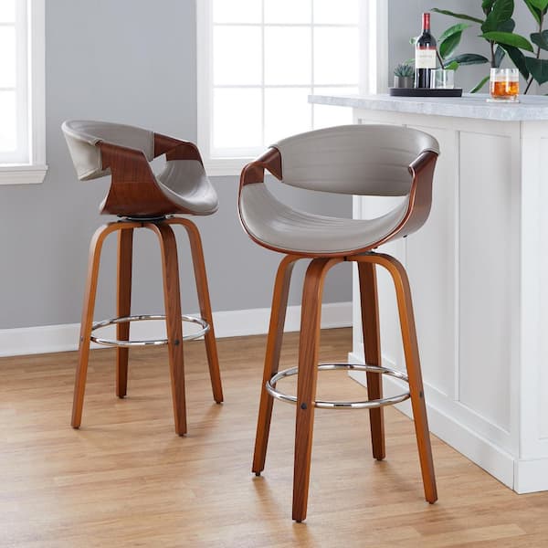 Symphony 30 in. Walnut Wood and Grey Faux Leather Fixed-Height Bar Stool with Bent Wood Legs, Round Footrest (Set of 2)