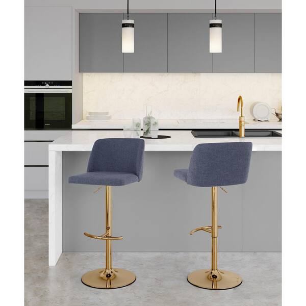 Toriano 33 in. Blue Fabric and Gold Metal Adjustable Bar Stool with Rounded T Footrest (Set of 2)