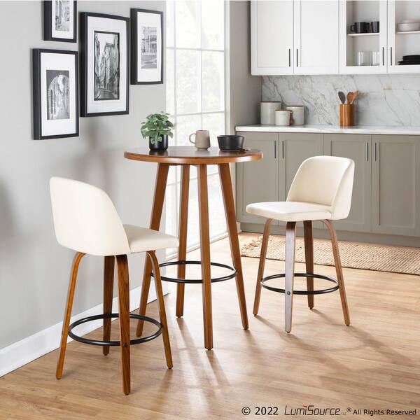 Toriano 35 in. Cream Faux Leather and Walnut Wood-Counter Height Bar Stool with Round Black Footrest (Set of 2)