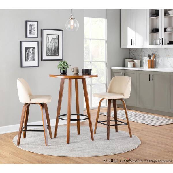 Toriano 35 in. Cream Faux Leather and Walnut Wood-Counter Height Bar Stool with Square Black Footrest (Set of 2)