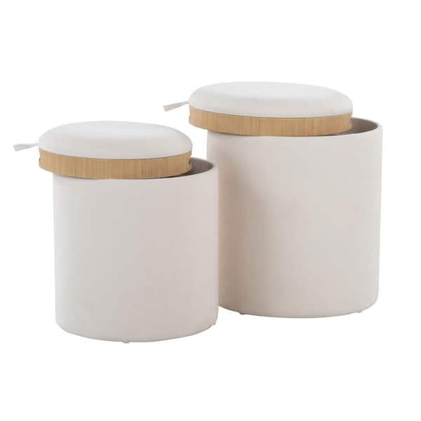 Tray Cream Fabric and Natural Wood Nesting Ottoman Set