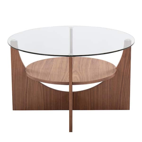 U-Shaped 31.5 in. Walnut Wood and Clear Glass Round Coffee Table