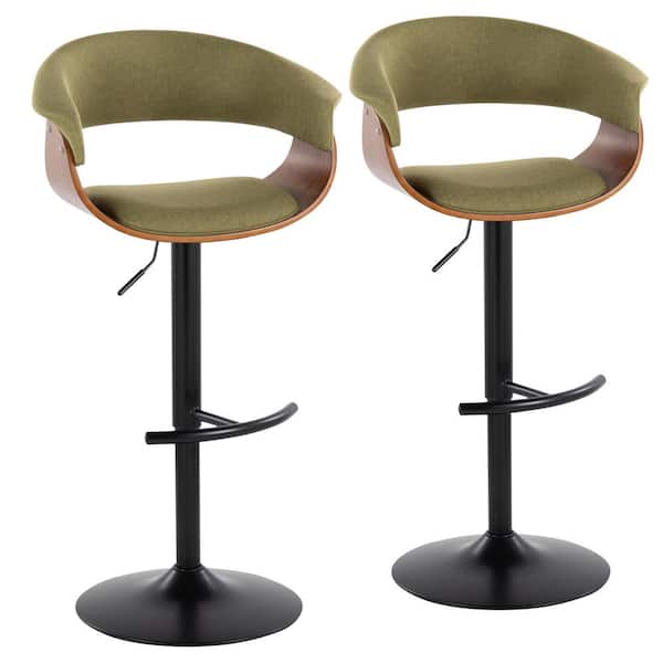 Vintage Mod 32 in. Green Fabric, Walnut Wood and Black Metal Adjustable Bar Stool Rounded T Footrest (Set of 2)