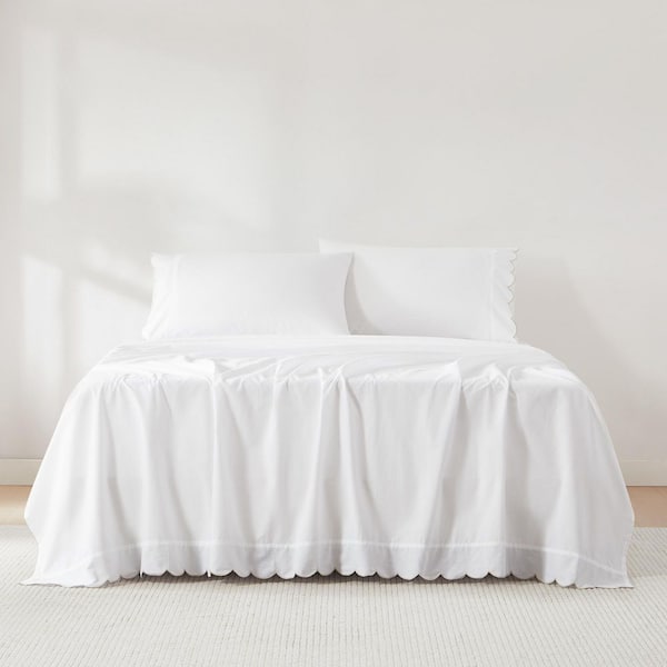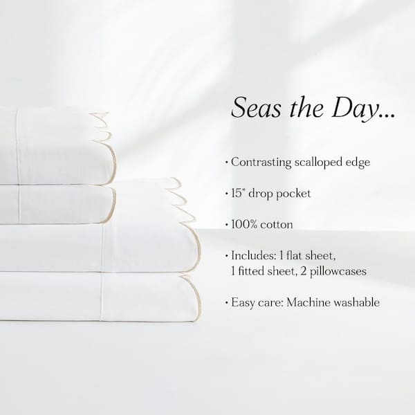 Coastal Chic Scalloped Edge 4-Piece Set Neutral Solid Cotton Queen Sheet Set