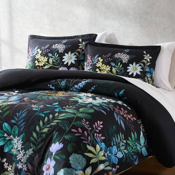 Fantasy Floral 3-Piece Black Cotton Full/Queen Duvet Cover Set