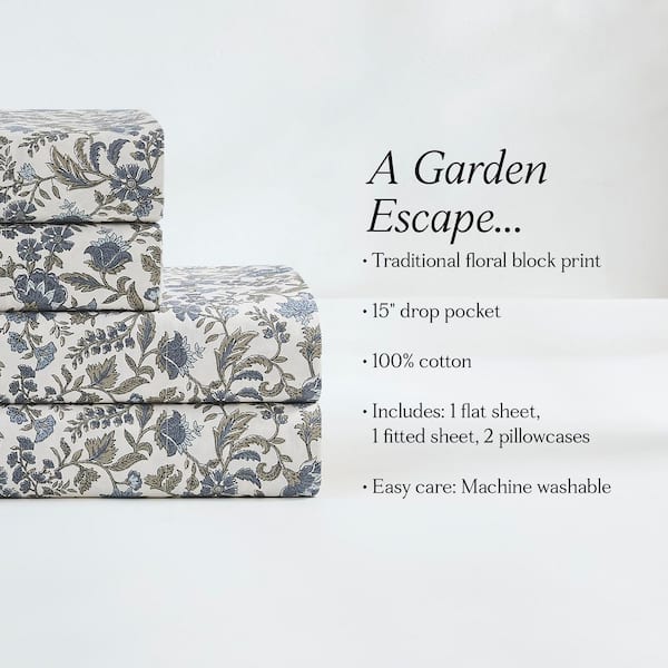 Lillian Block Print Cotton 4-Piece Set Blue Floral Cotton King Sheet Set