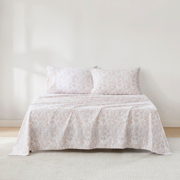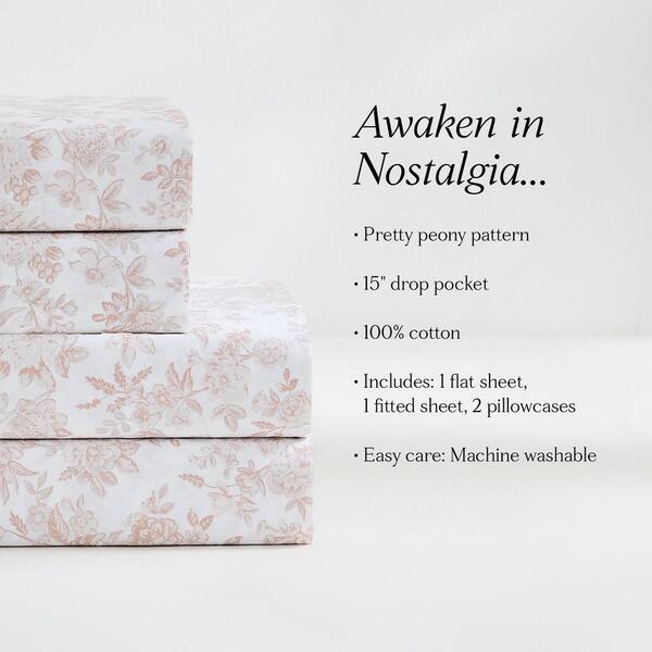 Peony Toile Cotton 4-Piece Set Peach Floral Cotton Queen Sheet Set