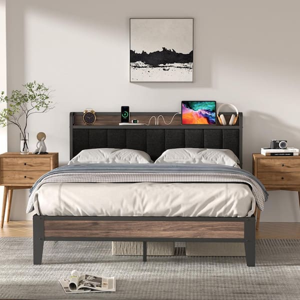 Modern Black Queen Upholstered Linen Platform Bed Frame with Charging Station and Storage Headboard