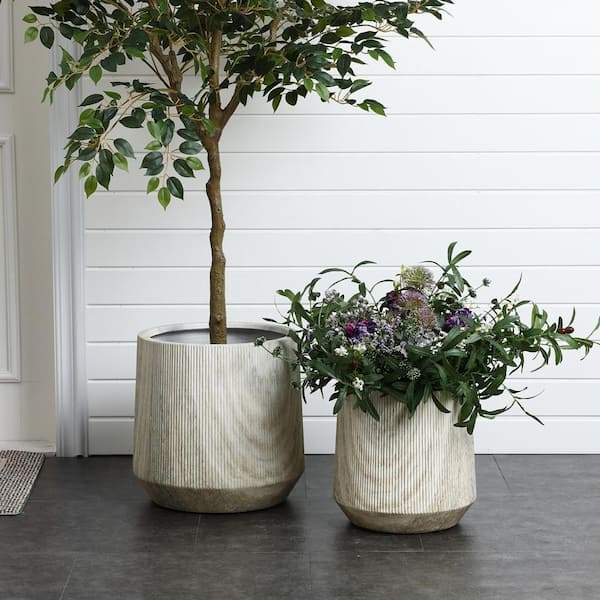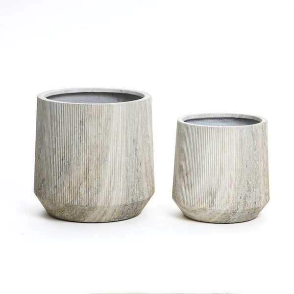 2-Piece Gray Ceramic Marble Ribbed Texture Floor Planter Set