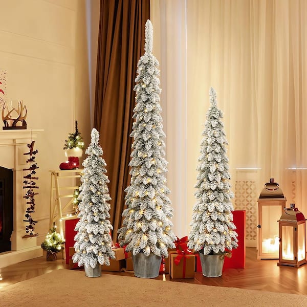 60 in. H 3-Piece Snow-Flocked Slim Artificial Christmas Tree Set with Battery Operated Lights