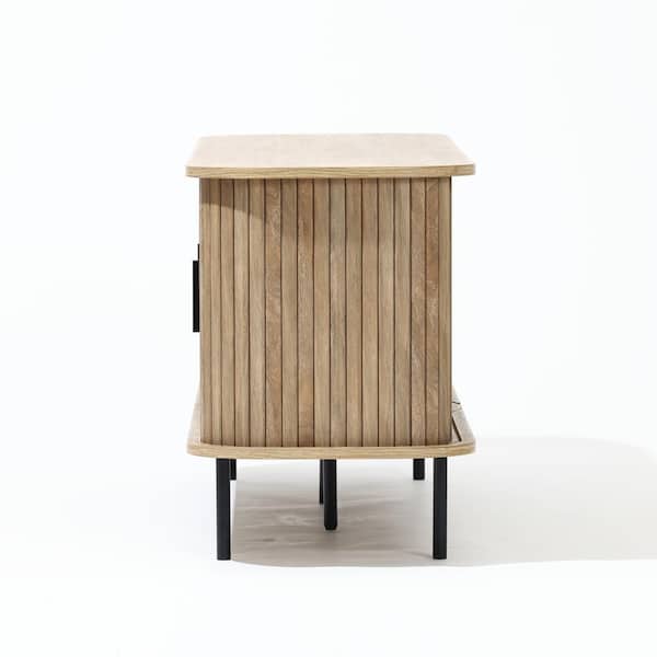 Mid-Century Modern Oak TV Stand Fits TV up to 65 in. with Slatted Slidng Doors