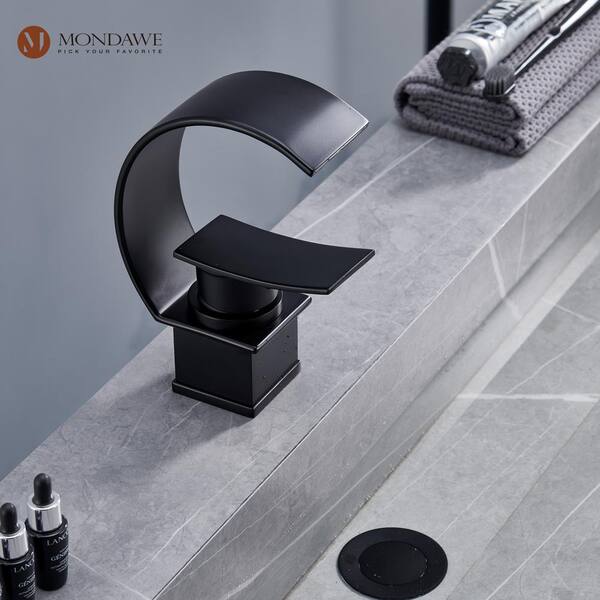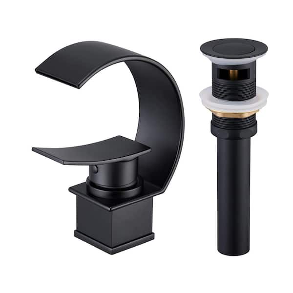 Luxury C Waterfall Single Lever Handle Arc Spout Single-Hole Bathroom Sink Faucet with Pop-up Drain in Matte Black