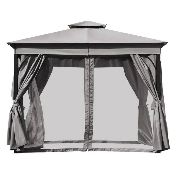 10 ft. x 10 ft. Grey Polyester Steel Outdoor Patio Gazebo Tent with Double Roofs Mosquito Netting and Privacy Screens