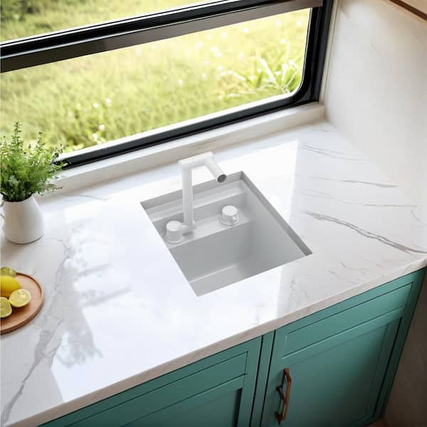 16-Gauge Stainless Steel 15 in. Undermount Single Bowl White Hidden Utility Kitchen Bar Sink w/Folding Faucet