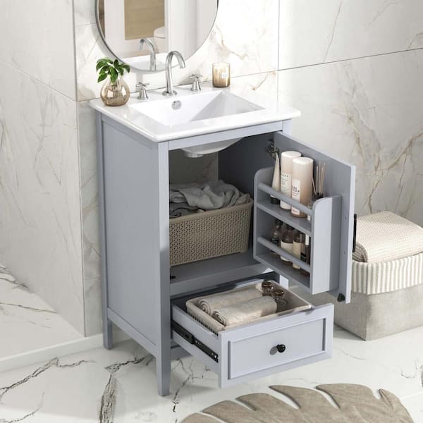 20 in. W Freestanding Bath Vanity in Grey with White Ceramic Top, A Door, Door Shelf Storage and Adjustable Foot Pads