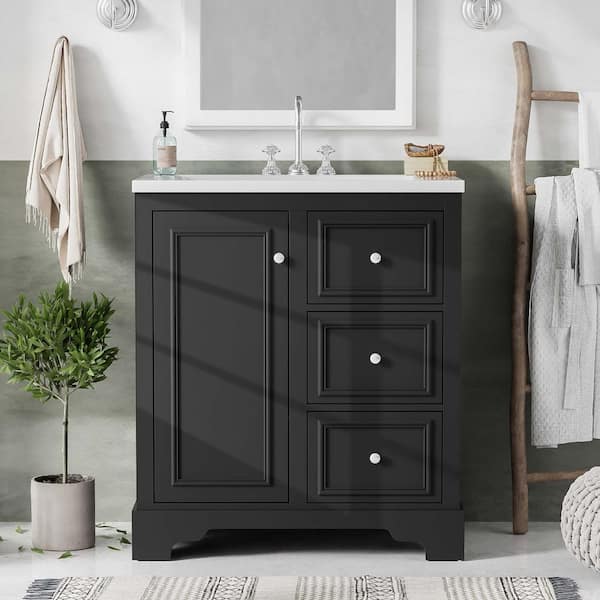 30 in. W Freestanding Bath Vanity in Black with White Ceramic Basin Top, 3-Drawers and Adjustable Shelves