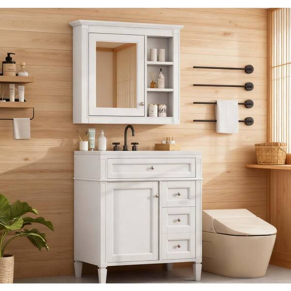30 in. W Freestanding Bath Vanity in White with White ceramic basin Top,3 drawers, adjustable shelves and Mirror cabinet