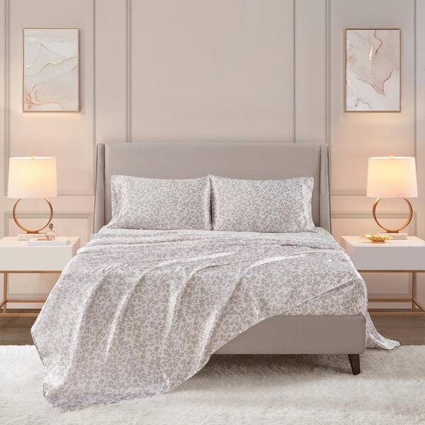 Printed Satin 4-Pcs Taupe Leopard Full Polyester Sheet Set