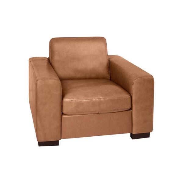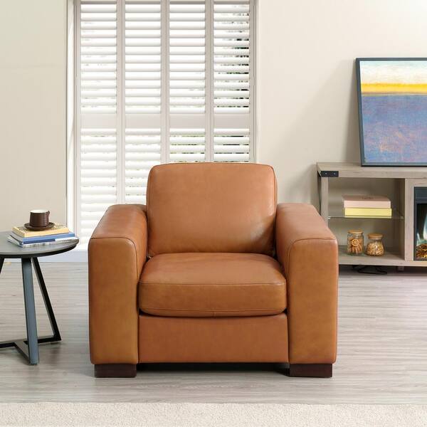 39 in. Mid-Century Cognac Tan Genuine Leather Arm Chair with Removable Cushions