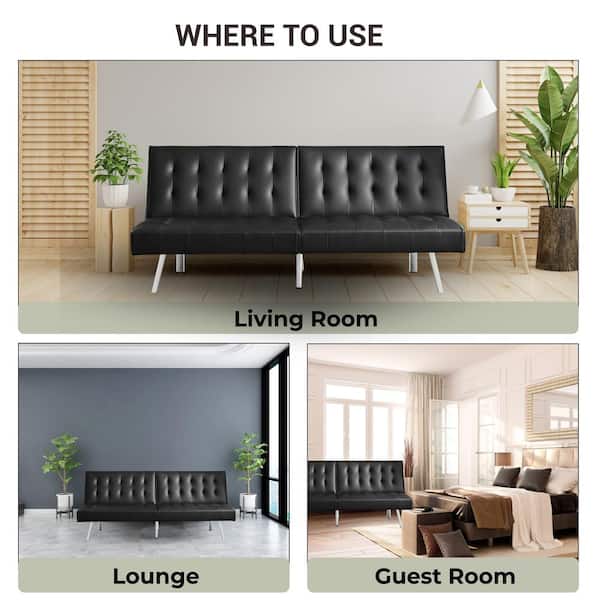 68.5 in. W Tufted Split Back Faux Leather Futon Sofa Bed in Black, Convertible Couch for Small Spaces