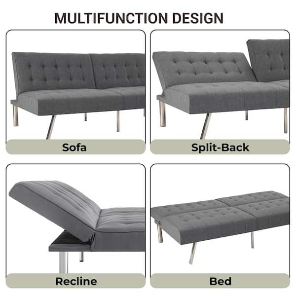 68.5 in. W Tufted Split Back Linen Futon Sofa Bed in Gray, Modern Convertible Sofa Bed with 3 Seats