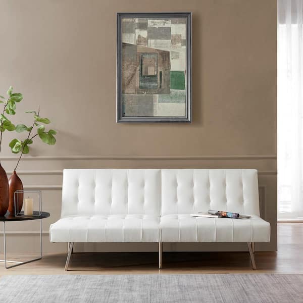 68.5 in W White Tufted Split Back Futon Sofa Bed, Linen Couch Bed, 3-Seat Futon Convertible Sofa Bed