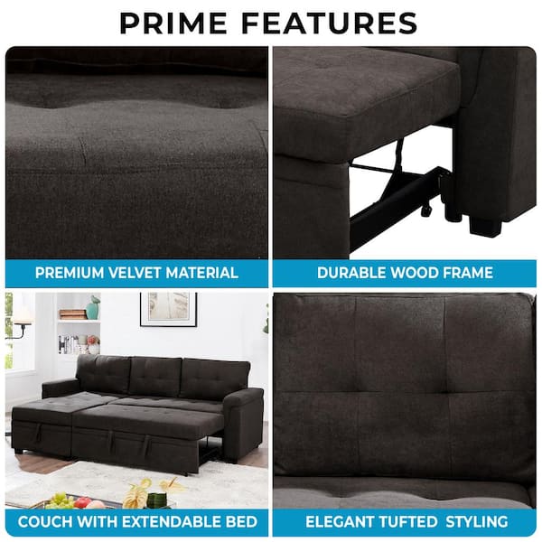 84.64 in. Velvet L-Shaped Sleeper Sectional Sofa with Square Arms in. Espresso, Reversible Chaise and Pull-Out Bed