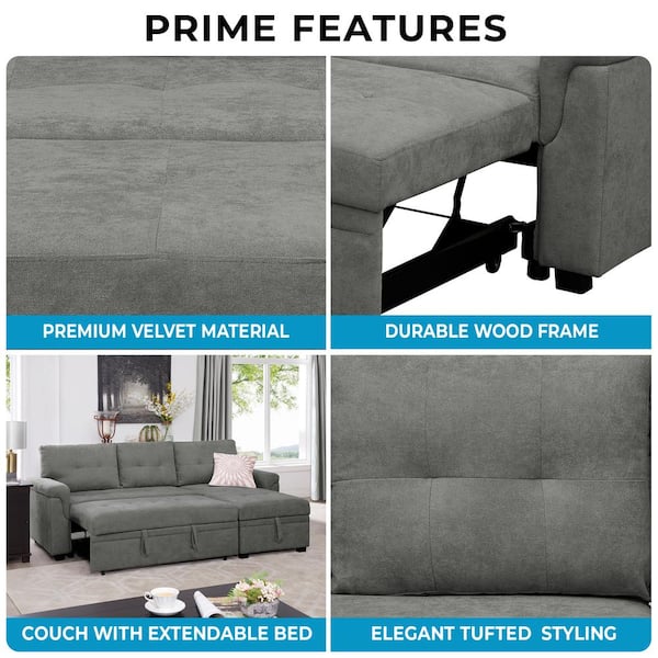 84.64 in. Velvet L-Shaped Sleeper Sectional Sofa with Square Arms in. Gray, Reversible Chaise and Pull-Out Bed