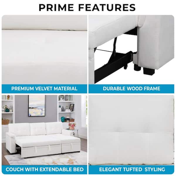 84.64 in. W Stylish Reversible Velvet Sleeper Sectional Sofa Storage Chaise Pull-Out Convertible Sofa in White