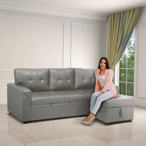 84 in. Square Arm 1-Piece Air Leather L-Shaped Sectional Sofa in. Gray with Chaise
