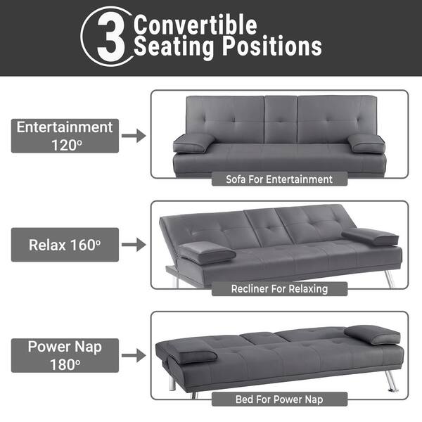 Gray Faux Leather Futon Sofa Bed with Armrest and 2-Cup Holders-Convertible Couch with Metal Legs