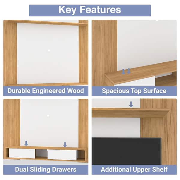 Natural/White 70 in. Multi Storage Wall Media Center with Floating Shelves and Hidden Compartments for TVs up to 70 in.