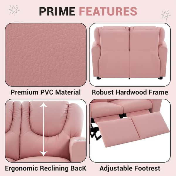 Pink 37 in. PVC Rectangular Kids Recliner Loveseat Chair with Footrest and Cup Holders in Pink